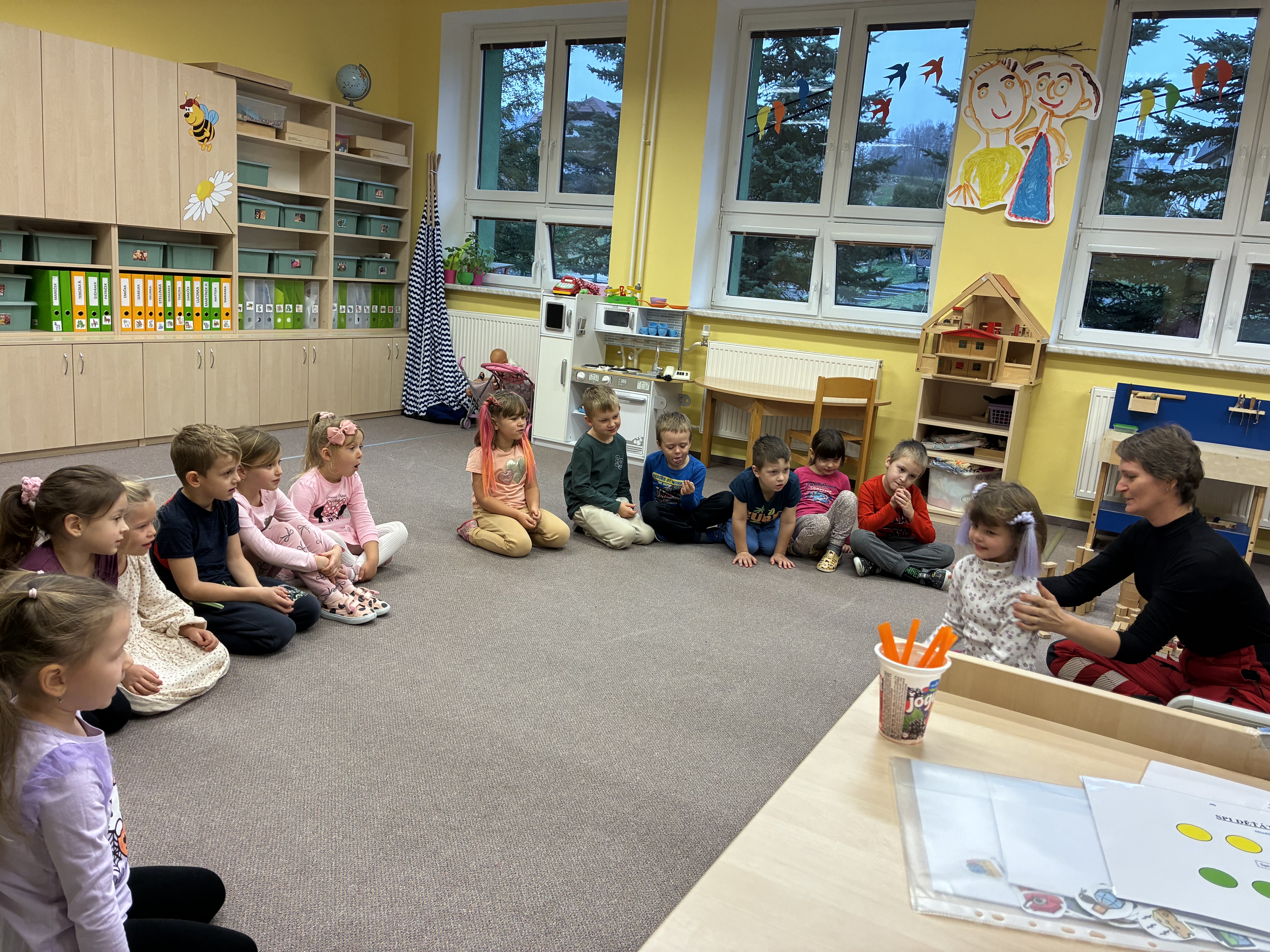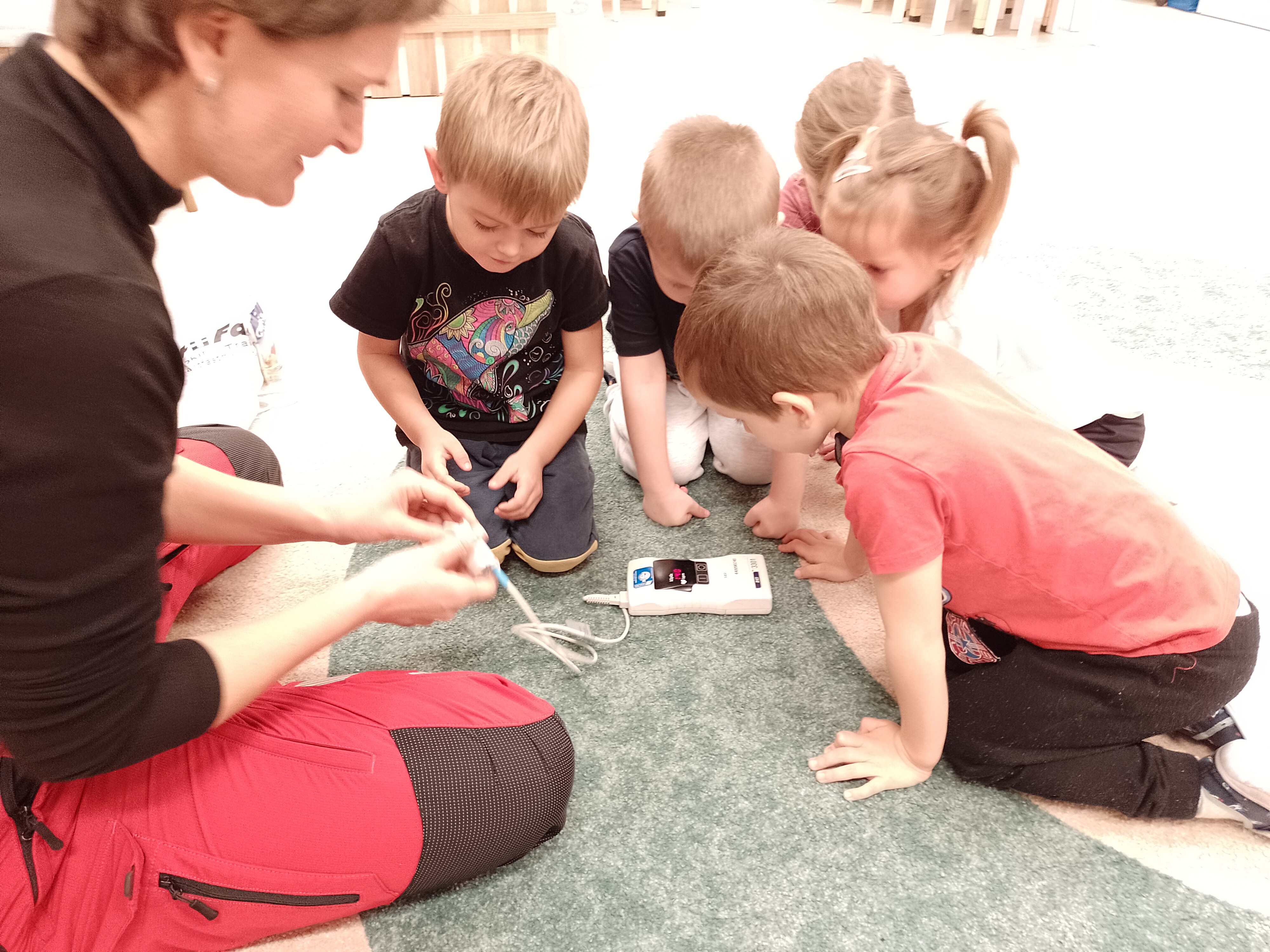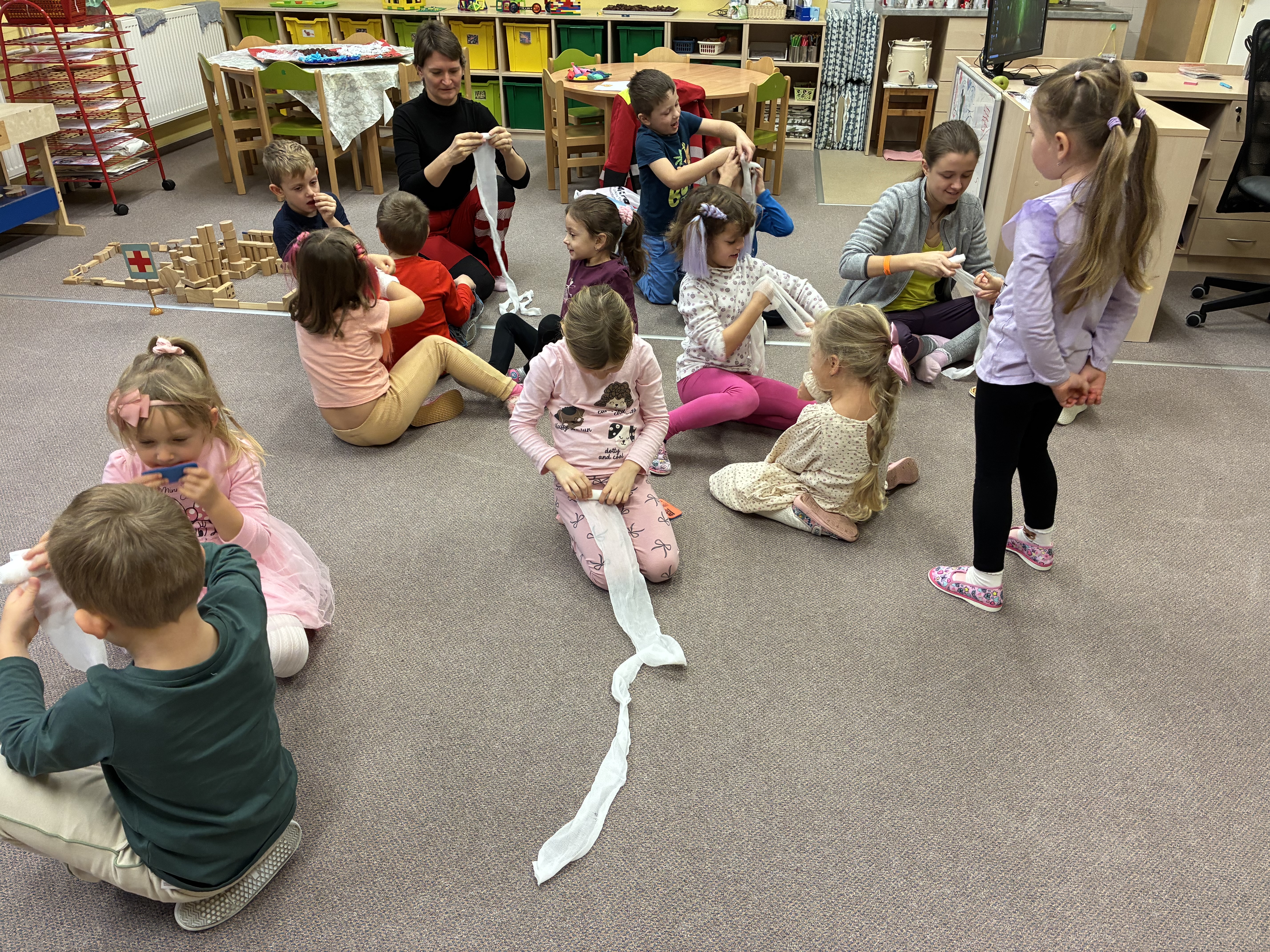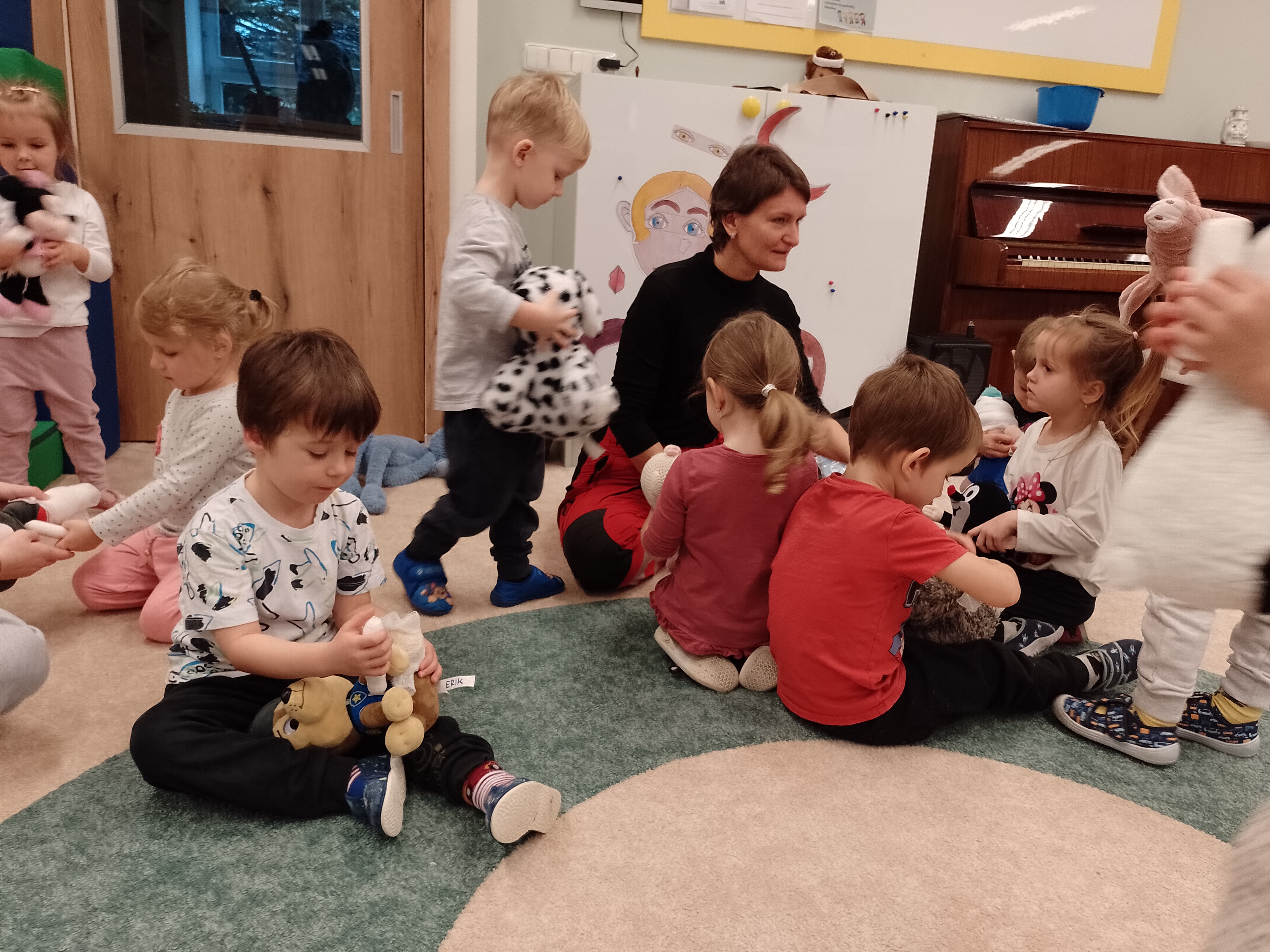 Ve čtvrtek 20. 11. nás v naší školce navštívila jedna z našich maminek, profesí lékařka. Pohovořila s námi o důležitostí chránit si své zdraví a prakticky ukázala, kolik potíží nám může způsobit malý bonbónek či vdechnuté sousto. Vyzkoušeli jsme si, jak dostat překážku z dýchacích cest ven a jak ošetřit drobná zranění. Vše doporučené jsme využili při péči o plyšáky, které si děti tento den přinesly z domova. Všechny bolístky jsme řádně obvázali a plyšáčky uložili do klidu na postýlky. Děkujeme za cenné informace.