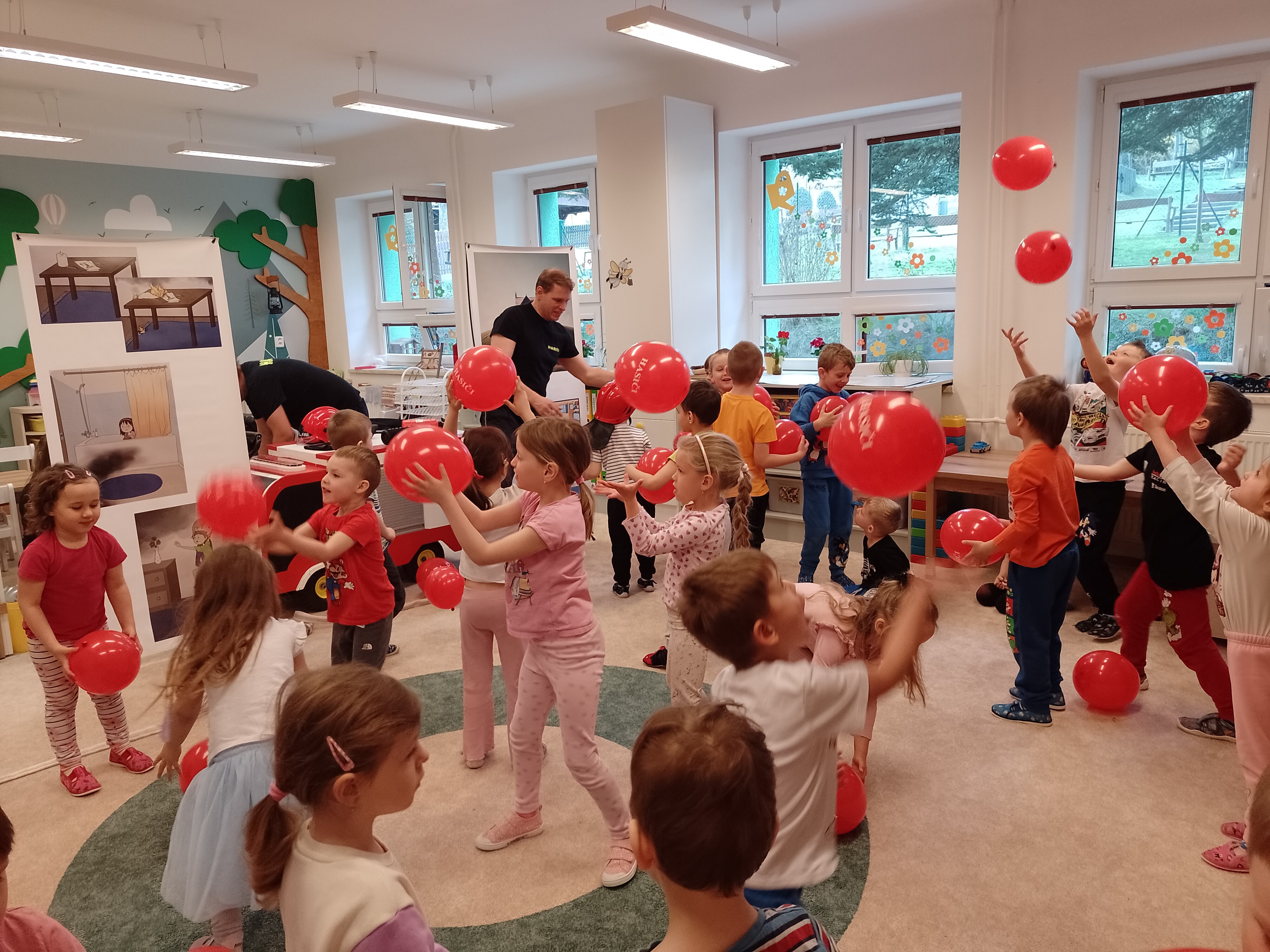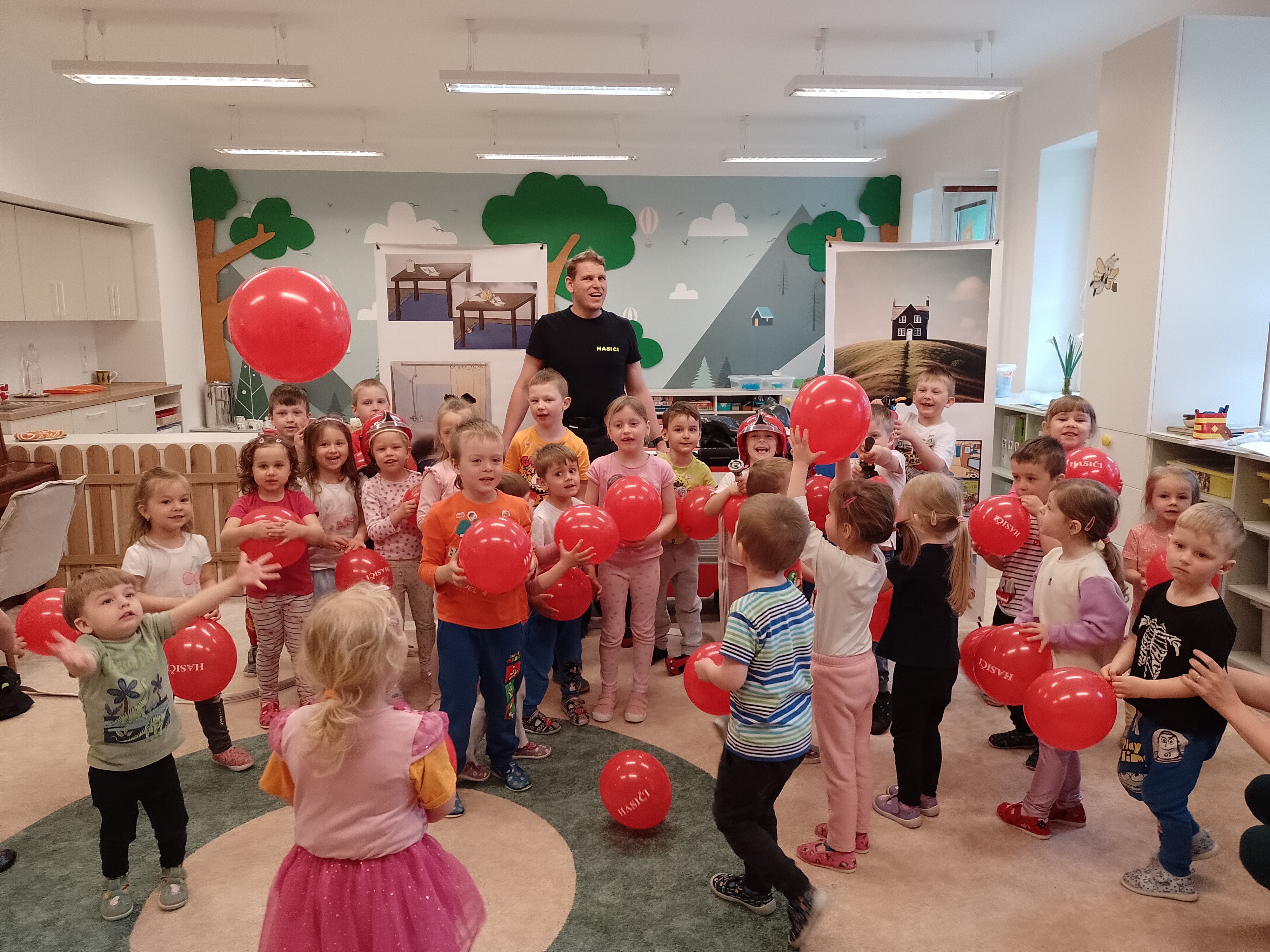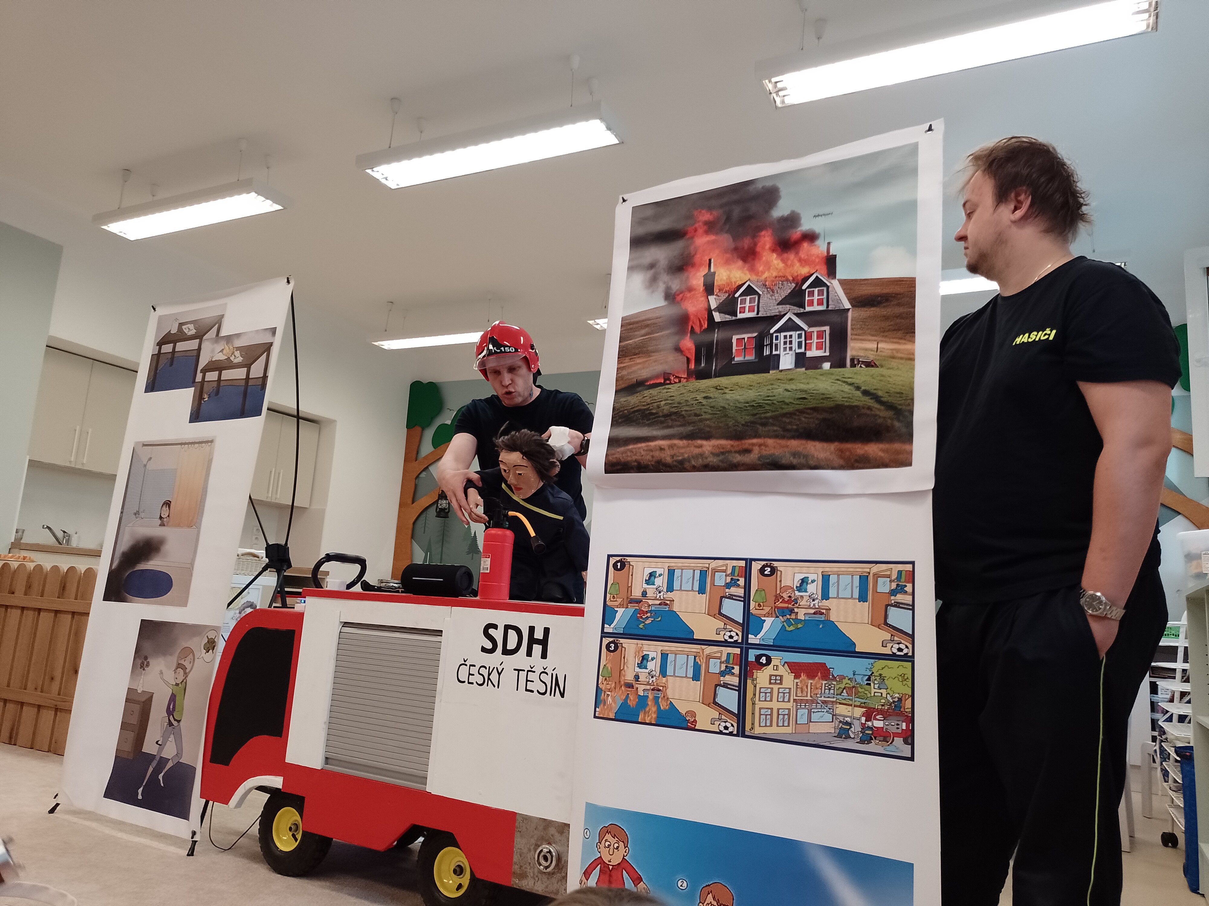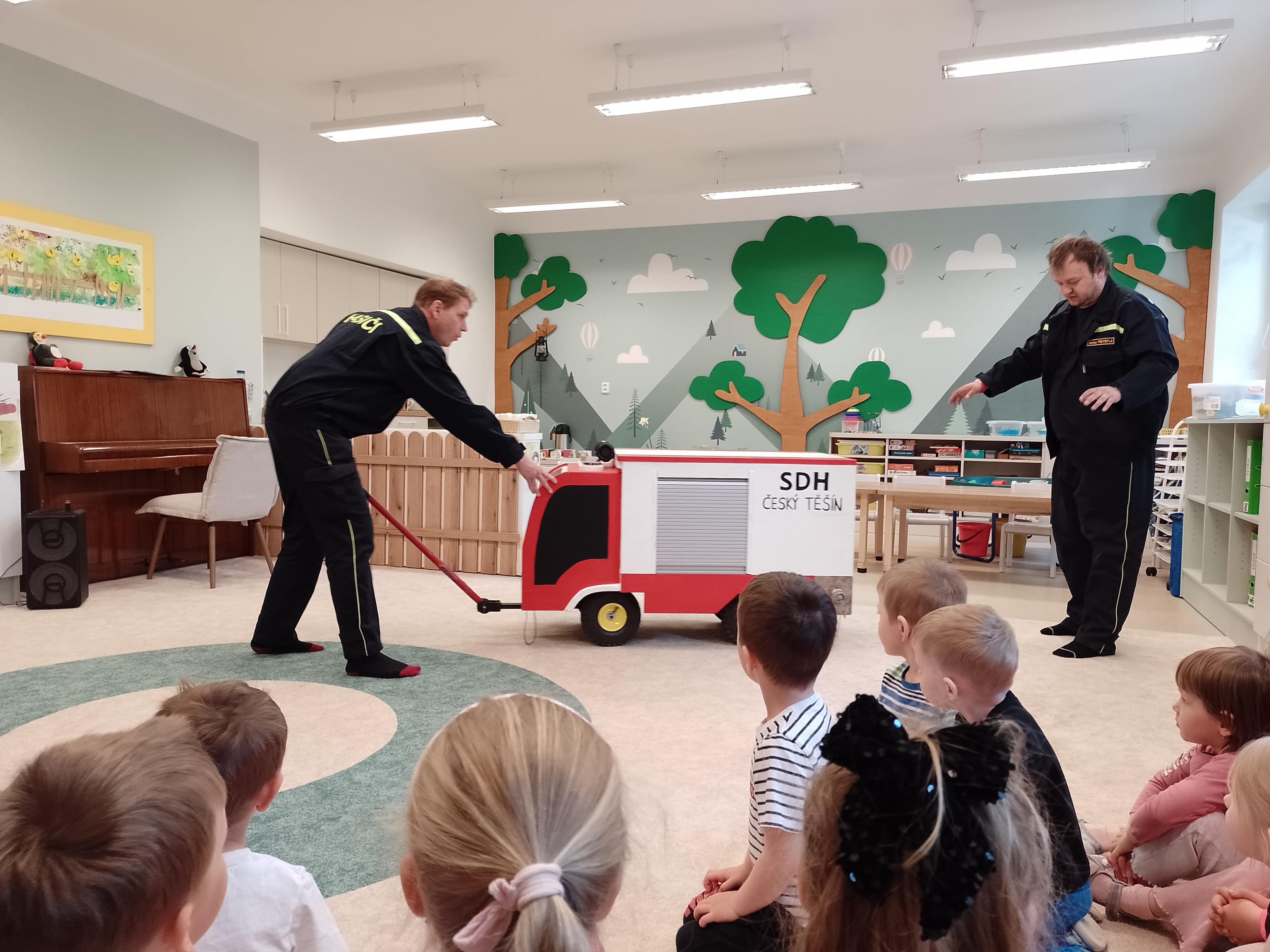 V pátek 24.4. nás navštívili dva sympatičtí pánové, členové DHS Český Těšín. Přijeli k nám s pohádkovým příběhem, prostřednictvím kterého dětem ukázali, jaký je oheň dobrý sluha, ale zlý pán. Vzhledem k tomu, že tito pánové jsou nejen dobrovolní hasiči, ale i členové těšínského divadla, bylo se na co dívat. Ale nejen dívat! Děti se přímo do boje s “ohněm” zapojily, vyzkoušely si pomůcky hasičů a dozvěděly se mnoho užitečných informací i rad, jak je třeba se, v případně ohně, zachovat. Představení jsme si velice užili a zase jsme o něco moudřejší.