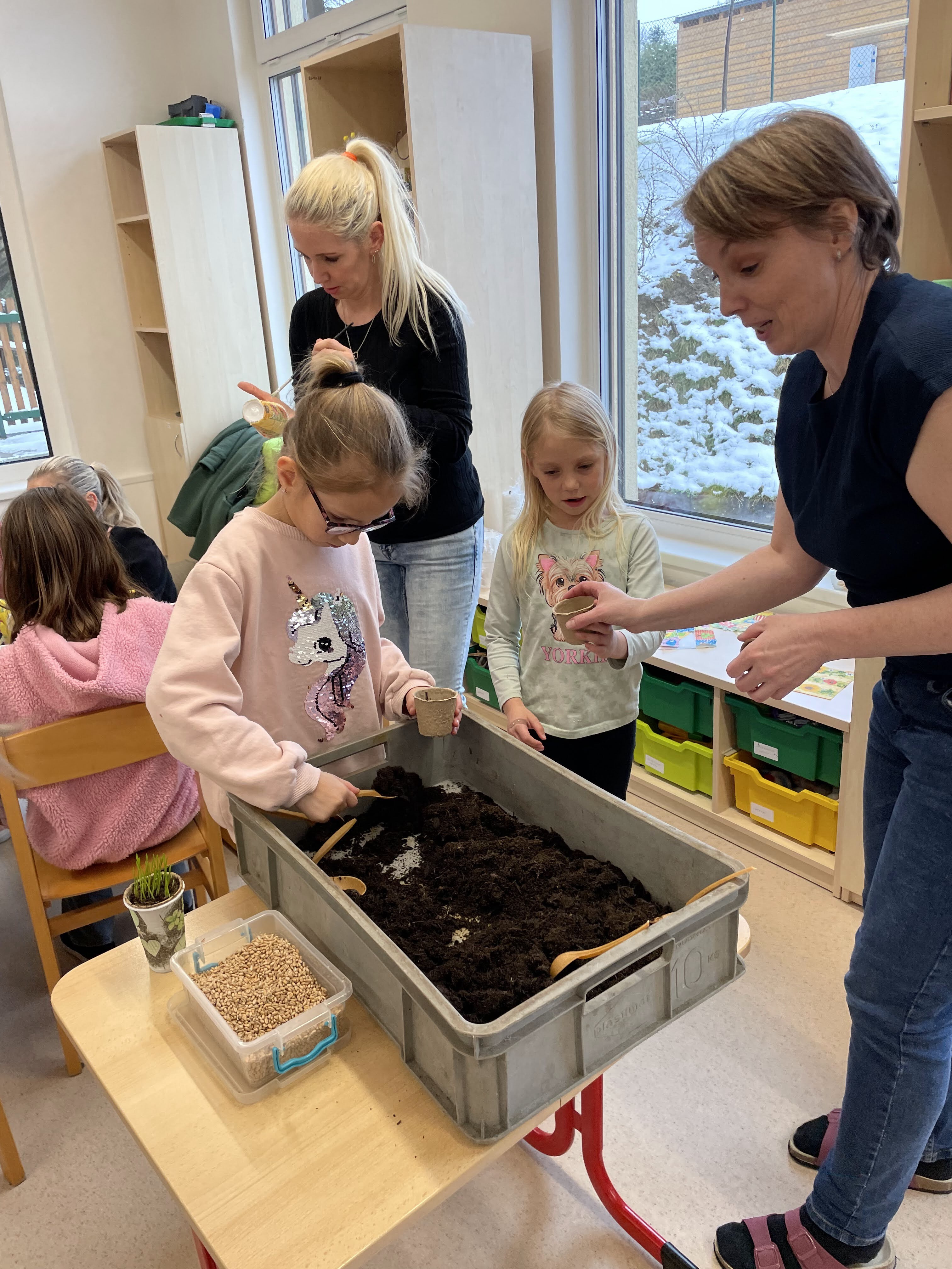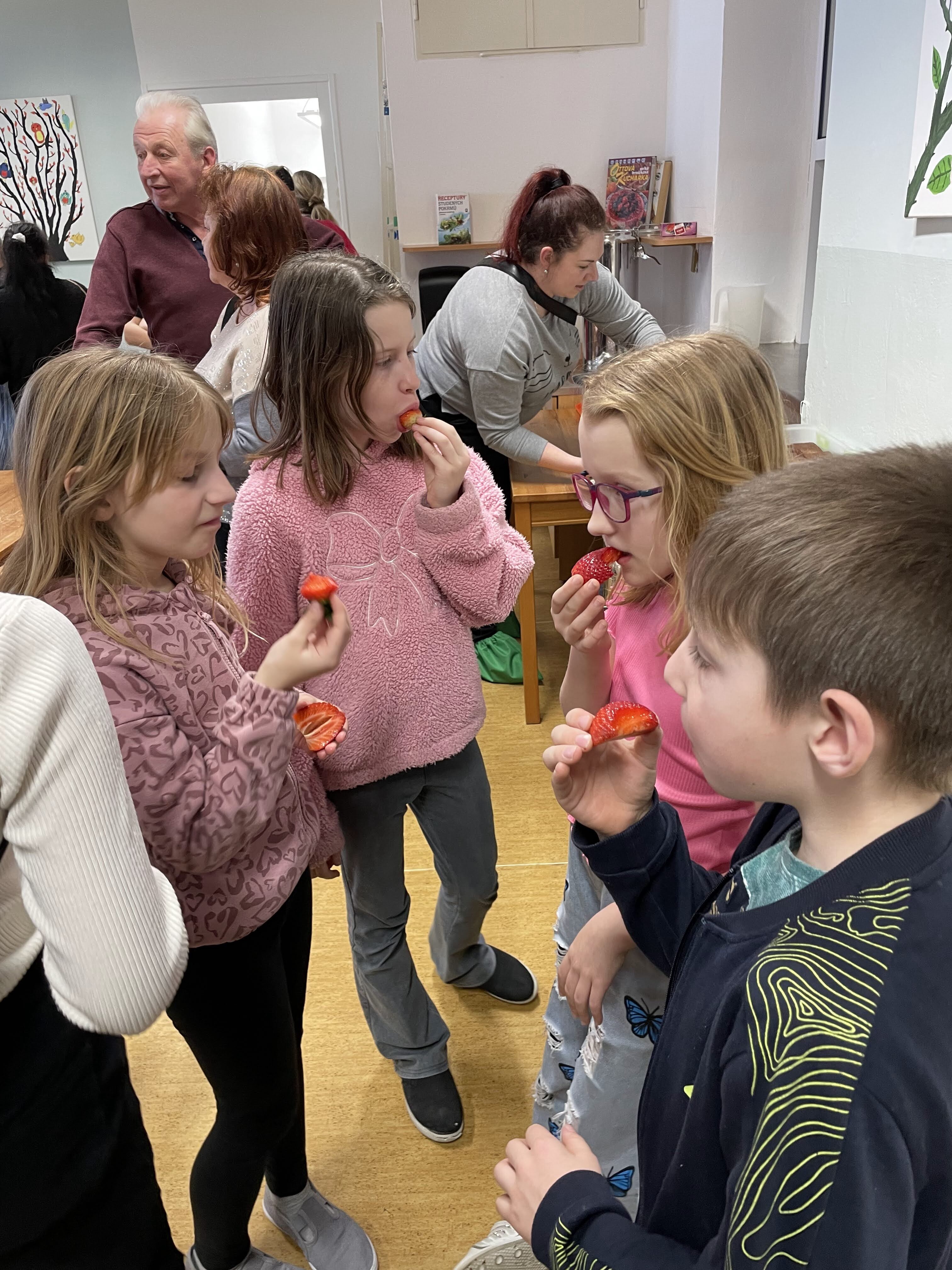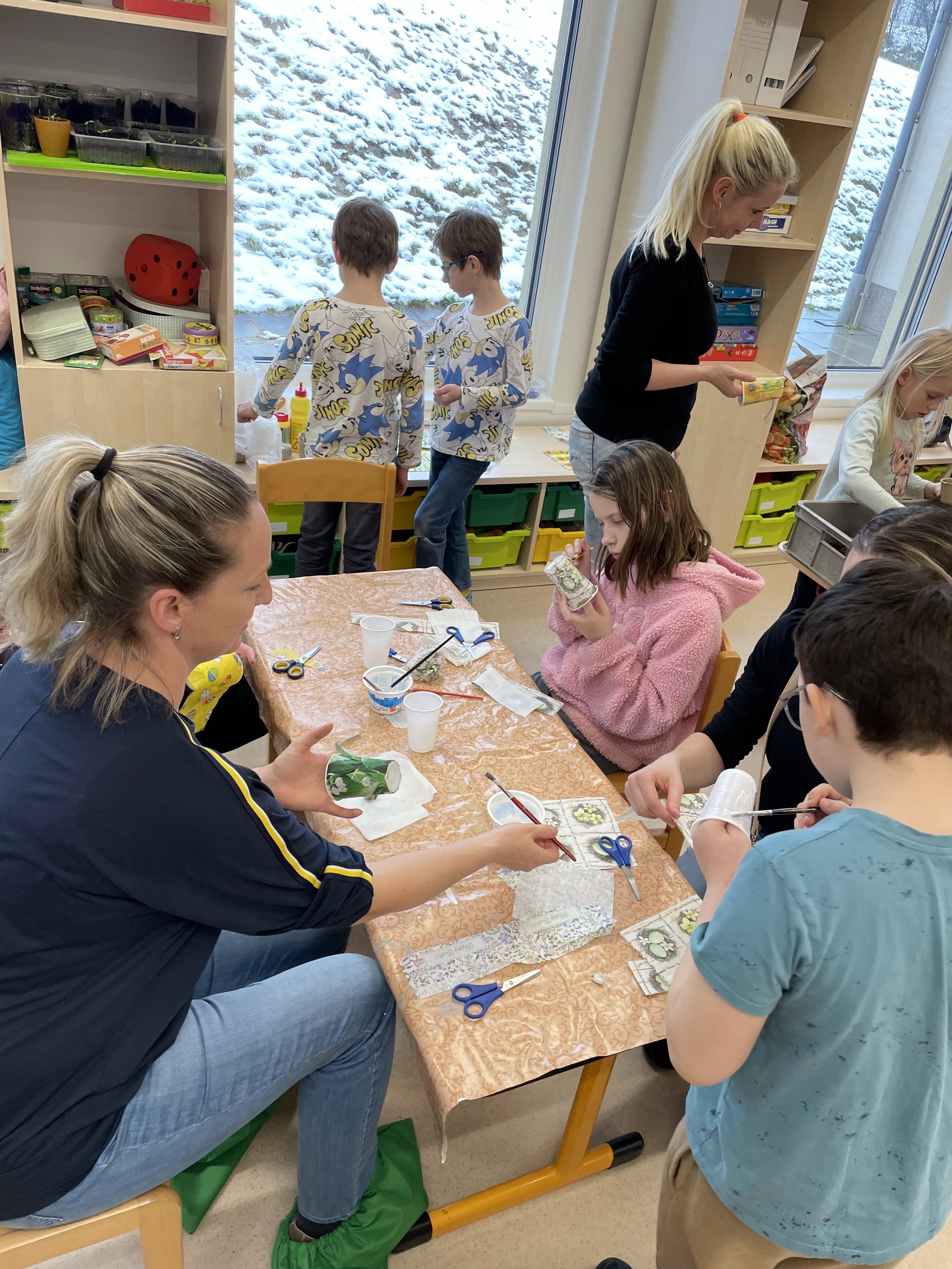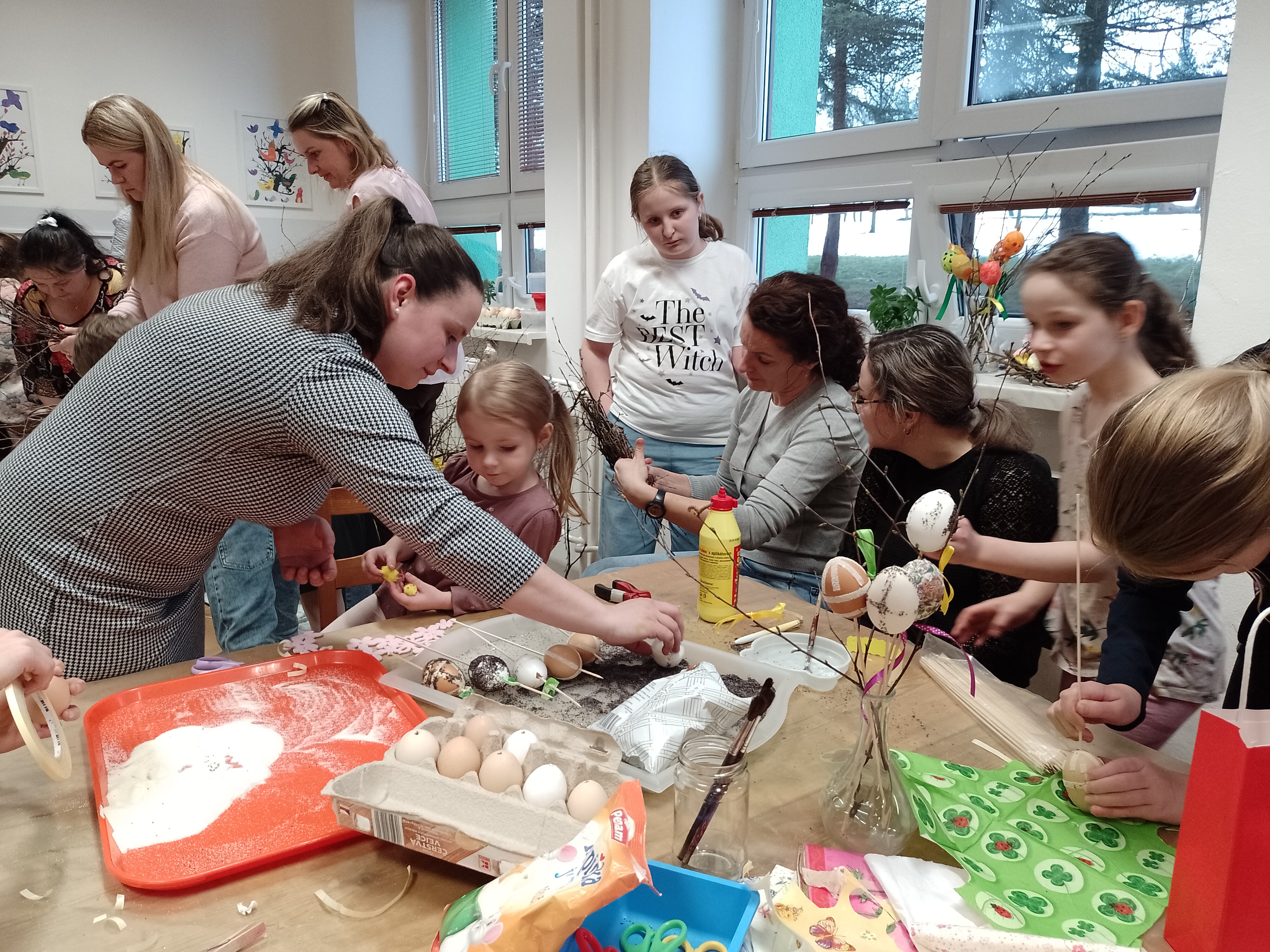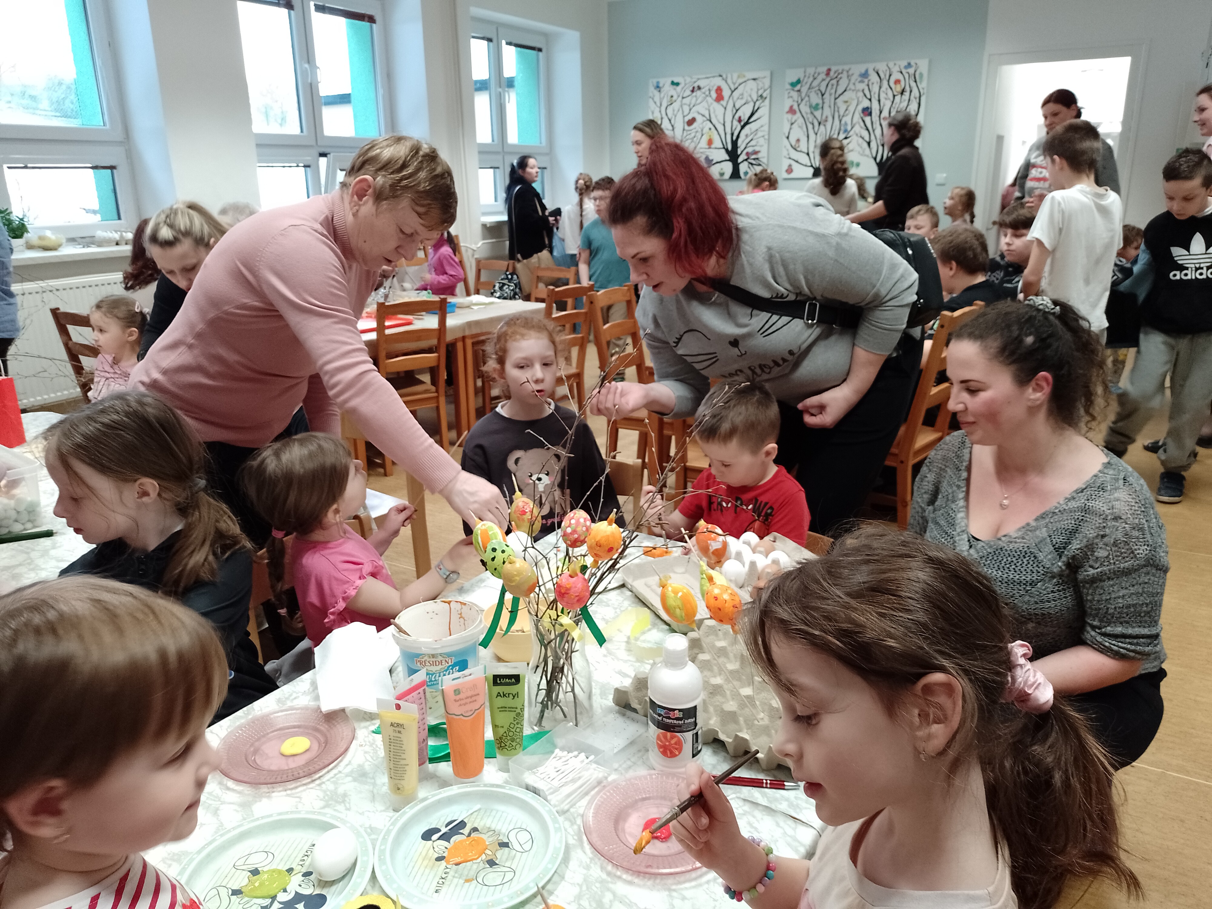 I přesto, že počasí za okny připomínalo spíše čas vánoční, 26. března se prostory školní jídelny a učebny 1. ročníku proměnily v dílny s tématikou Velikonoc. Děti z mateřské i základní školy přišli podpořit i přiložit ruku k dílu rodiče s prarodiči, a tak si díky této spolupráci děti mohly odnést hned několik různorodých výrobků k navození sváteční a jarní atmosféry ve svých domovech. Ať už to byl zdobený věnec z březového proutí, dekorované kraslice, malované zápichy do květináčů, které si bylo možné taktéž svépomocí osít i ozdobit ubrouskovou technikou zvanou "dekupáž", nebo šité textilní slepičky k zavěšení a nechyběly ani ručně pletené pomlázky z vrbových proutků. Po takové práci přišla všem k duhu vzpruha ve formě kávy z Fairtrade produkce, čaje a rautu s dobrotami, o které se postaraly šikovné maminky. Čas nám všem v milé společnosti a s tvůrčím nasazením rychle utíkal. Těšíme se, že se opět a již brzy setkáme u další společné akce, kterou bude Den maminek.