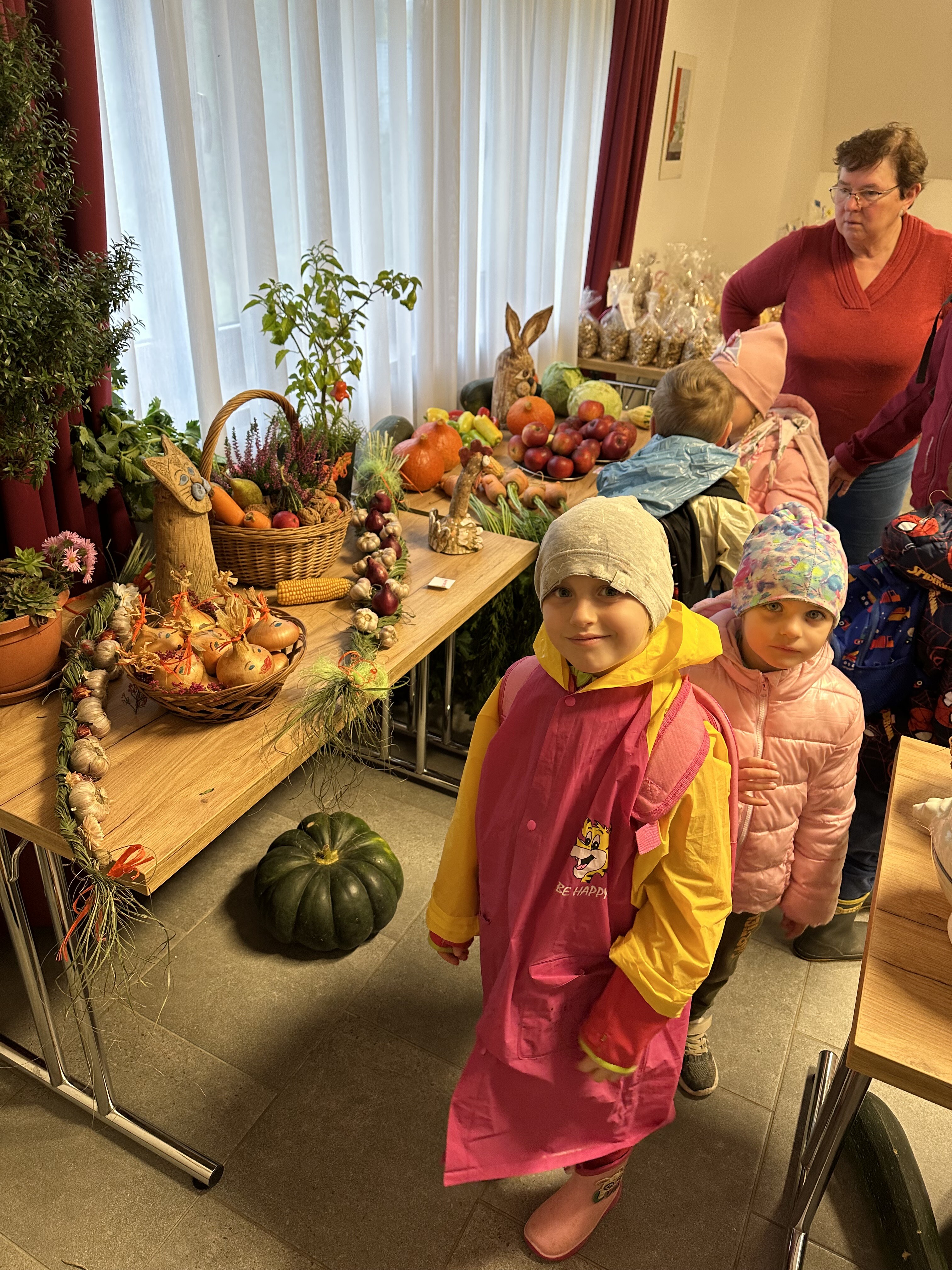 Dne 10.10.2025 třída Včelek navštívila Výstavu ovoce a zeleniny v Písku. Bylo zřejmé, že letošní úroda stála za to. K vidění bylo mnoho, od brambor až po meloun, a nejen to. Děti objevily i slepičí vajíčka, jablečný mošt, křížaly, hřiby a medové perníčky. Výlet jsme zakončili návštěvou kamarádů z MŠ Písek. Přijali jsme jejich pozvání a společně jsme si pohráli a zazpívali.