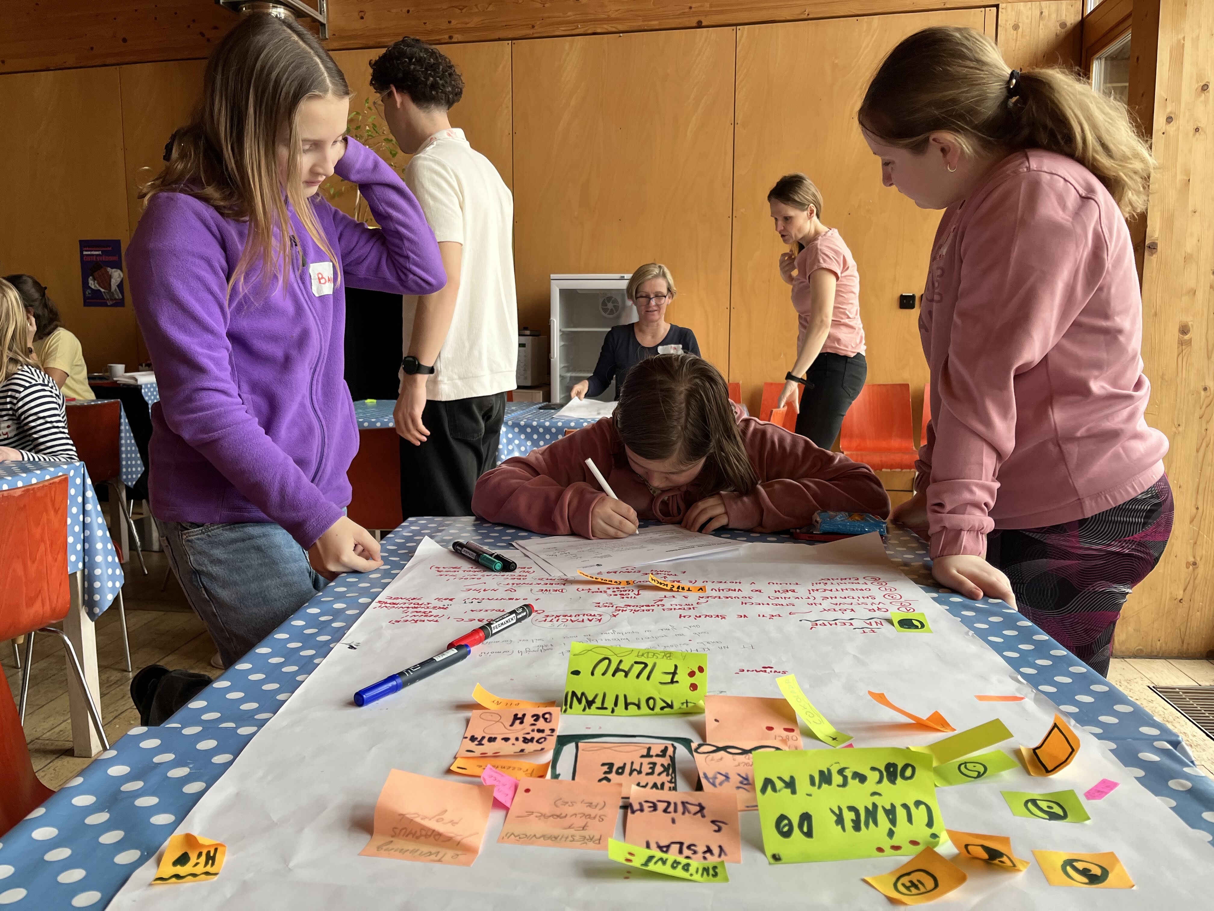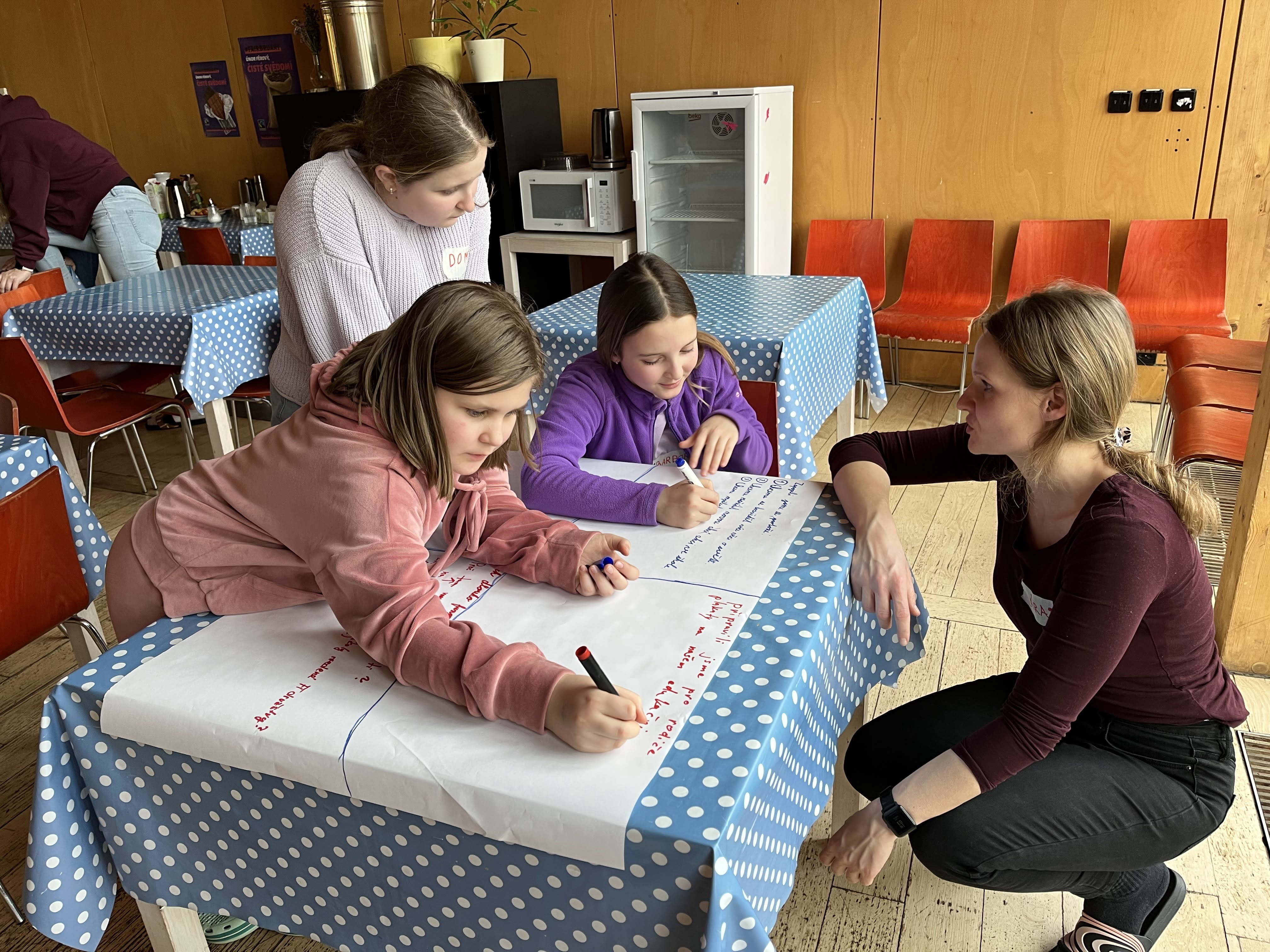 Druhý den přišla na řadu praxe. Každý tým si vybral vlastní nápad na osvětovou akci a začal ho plánovat do podrobností: co chce sdělit, koho chce oslovit, jak to celé zorganizovat. Hotové plány pak týmy navzájem komentovaly a pomáhaly si.